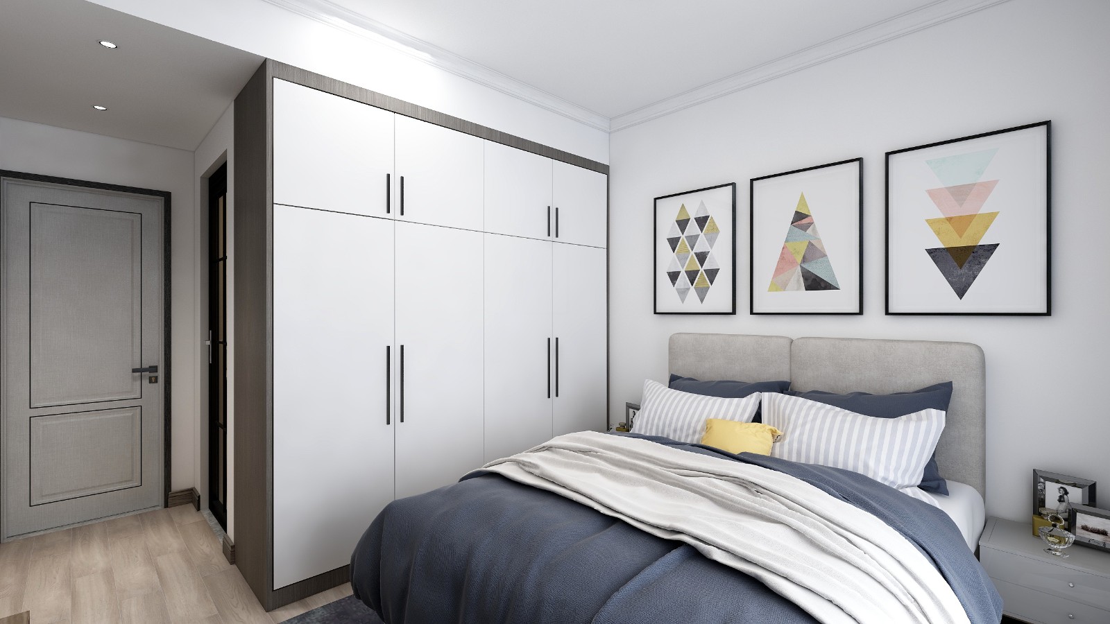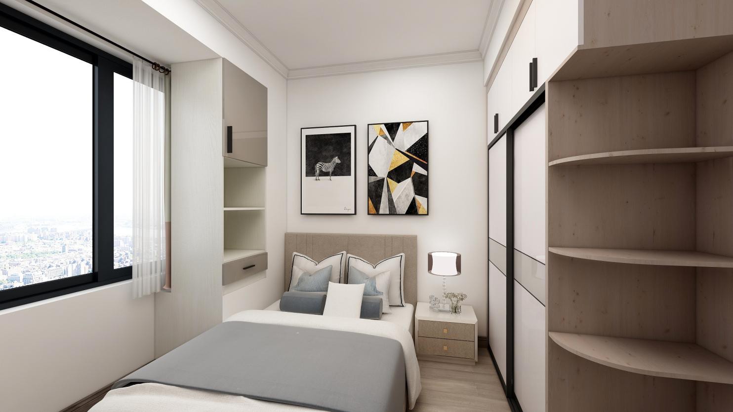 主臥室采用大面積留白,與裝飾掛畫結合,打破白色墻壁的呆板,營造出空間的層次關系。