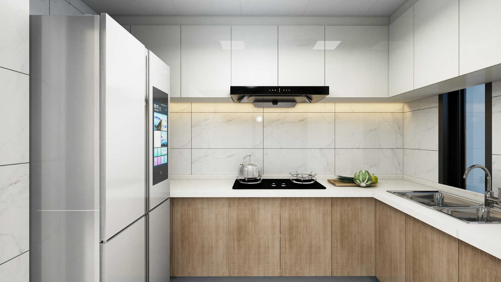 廚房頭頂上的吊柜與櫥柜,足夠的收納空間讓整個(gè)廚房變得十分簡(jiǎn)潔,讓你愛(ài)上烹飪。